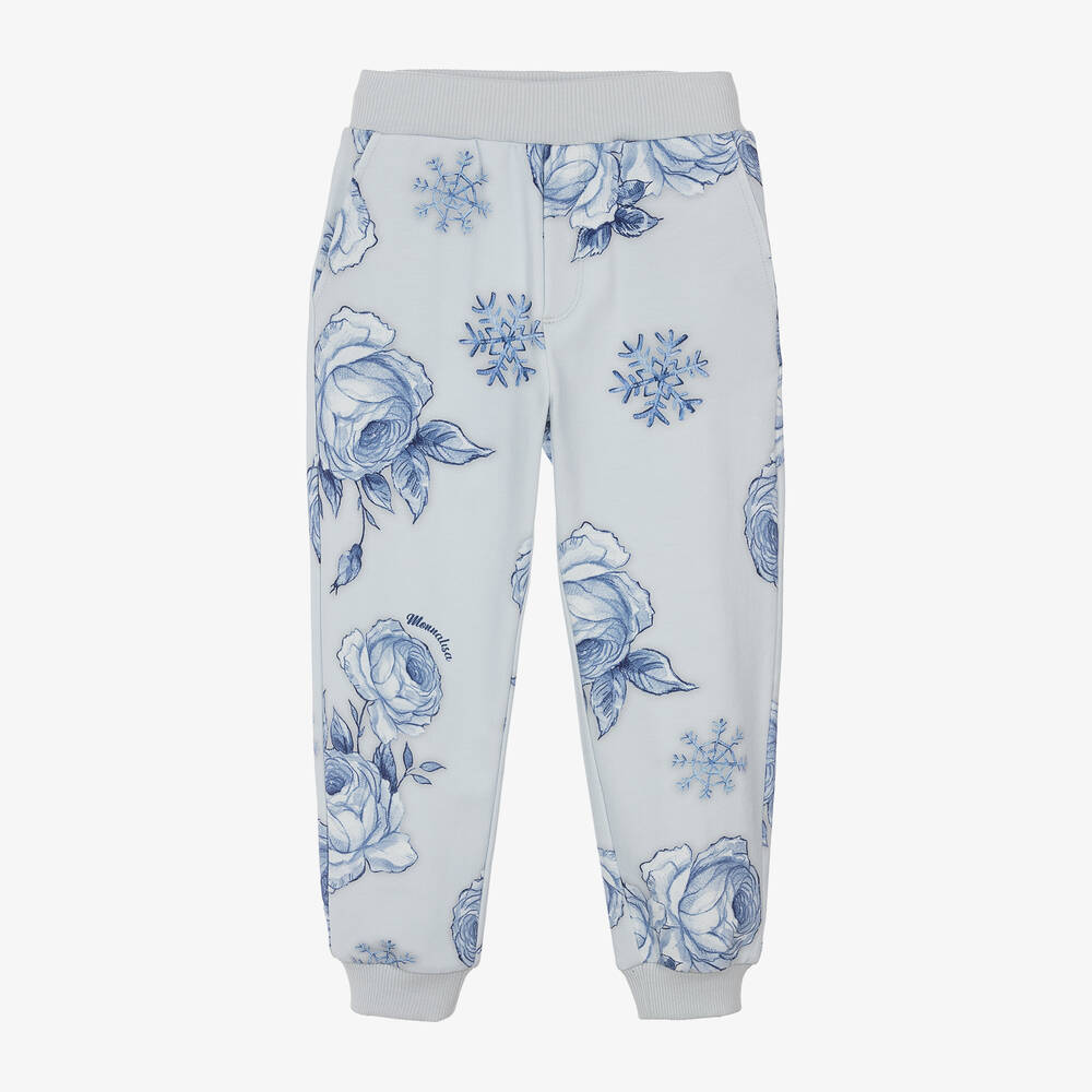 Pretty pale blue joggers for girls by Italian designer Monnalisa, made from soft and stretchy cotton jersey. Beautifully patterned with roses and snowflakes in a deeper shade of blue, these stylish joggers have the designer's name subtly printed throughout. They have useful pockets on the front, cuffed ankles and a ribbed elasticated waistband for a comfortable fit.