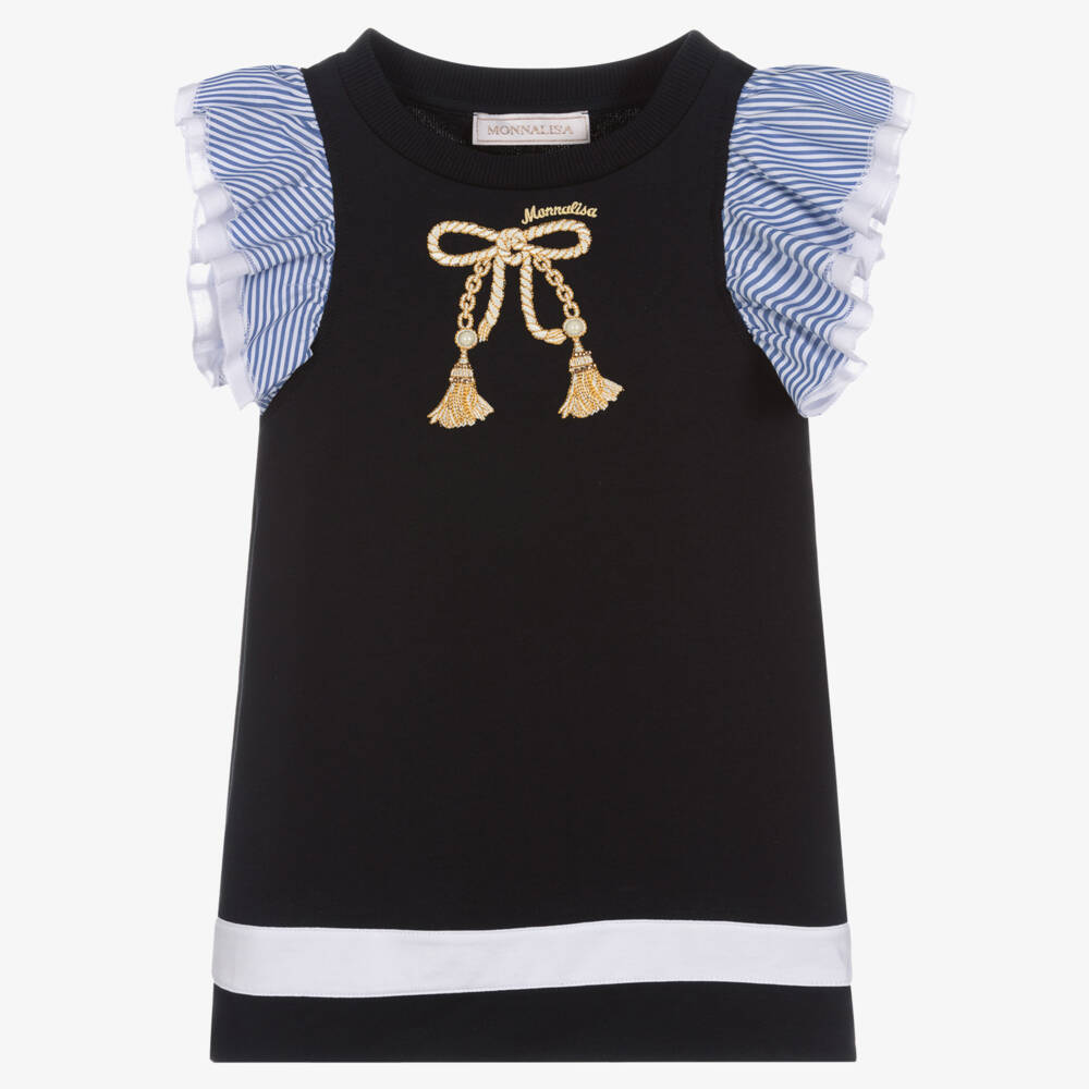 A lovely, nautical-themed navy blue cotton jersey dress for girls by Monnalisa. Stylishly casual, it has beautifully ruffled cotton sleeves in navy blue and white stripes over a plain white voile. The front has a sweet embroidered bow and logo in gold with diamanté and faux pearl appliqués for a touch of sparkle.