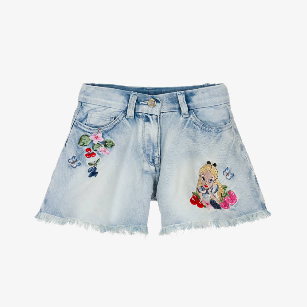 Washed blue denim shorts for girls by Monnalisa, with stylish frayed hems. They are beautifully embroidered with Alice in Wonderland, flowers and berries, and detailed with diamantés for a sparkly touch. A flared style with five pockets, they have an adjustable waist for a comfortable fit.