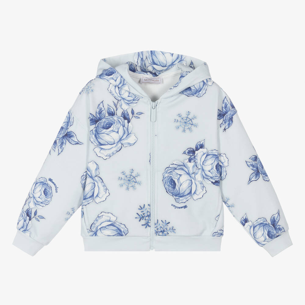 A pale blue hooded zip-up top for girls by Monnalisa, made in soft and comfortable cotton jersey. Designed with useful, concealed pockets, it is patterned with roses, snowflakes and logos in contrasting shades of blue for a pretty finish.
