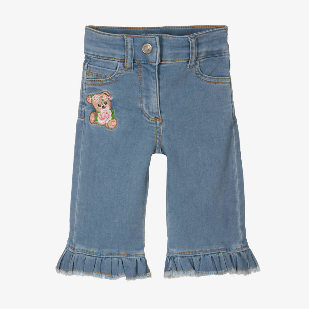 Light blue denim jeans for little girls by Italian designer Monnalisa, made in stretchy, lightweight cotton with frilled, frayed cuffs. With classic five-pocket styling, they have an embroidered pink rose on the back pocket and an embroidered bear with roses on the front. They fasten with an easy-to-use popper and zip on the front, with a useful adjustable waistband.