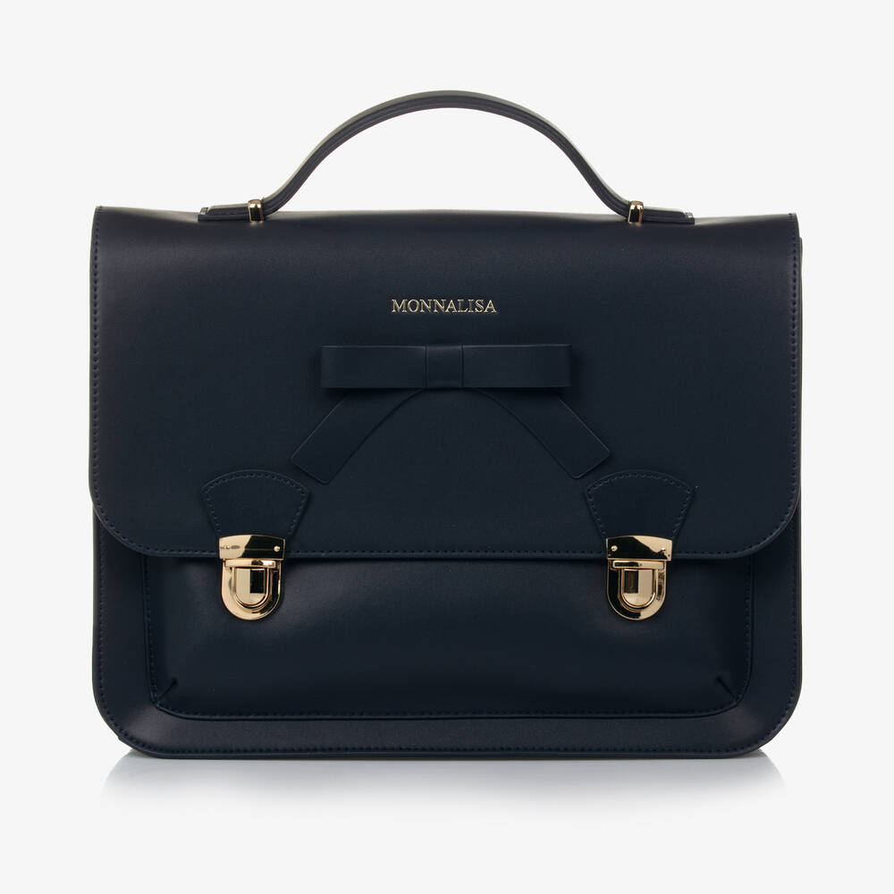 A smart navy blue leather blend satchel for girls by Italian brand Monnalisa, with shiny gold metal hardware. Sturdy and structured, this briefcase style bag has a zipped main compartment with internal zip pocket and a large slip pocket for easy organisation. The front flap fastens with two press clasps and has a pretty bow with a gold embossed logo above. Ideal for use as a school bag, it comes with two detachable and adjustable straps so it can be worn as a backpack.