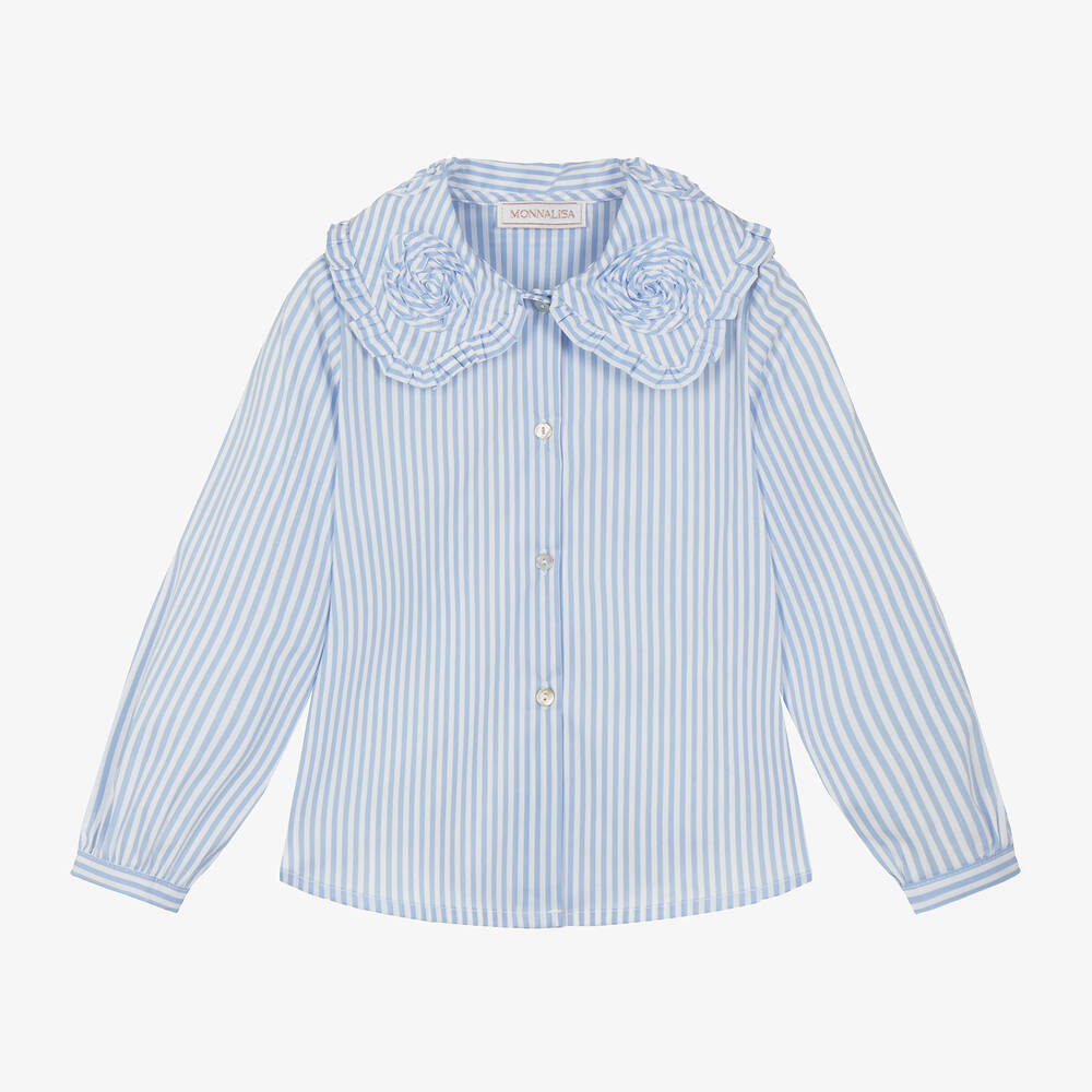 Smart pale blue and white striped, long-sleeved blouse for girls by Italian brand Monnalisa. Comfortable and lightweight with a slight stretch, it has a stylish, frilled collar decorated with appliqué flowers. There are iridescent, mother-of-pearl button fastenings on both the front and the gathered cuffs. The side sems have vents for comfort.
