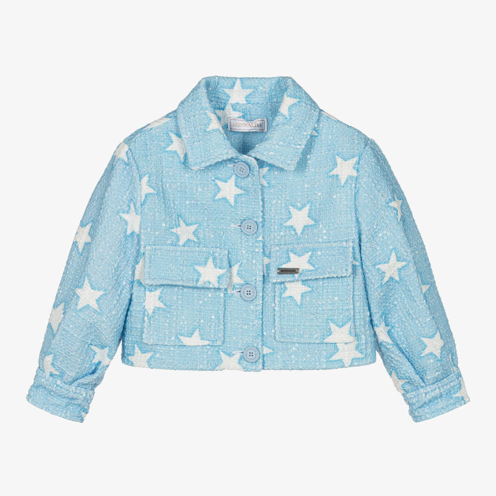 Powder blue jacket for girls by Monnalisa, made in sequin covered tweed. Stylish and fun, it is cropped and has a white star pattern. It has a smart collar and patch pockets on the front, with a sliver metal logo plate on one for a subtle designer finish. There are branded button fastenings on the front and the cuffs and a silky lining patterned with logos.