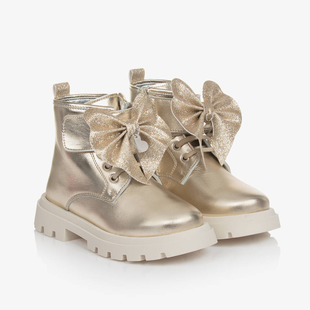 Girls Gold Leather Bow Ankle Boots