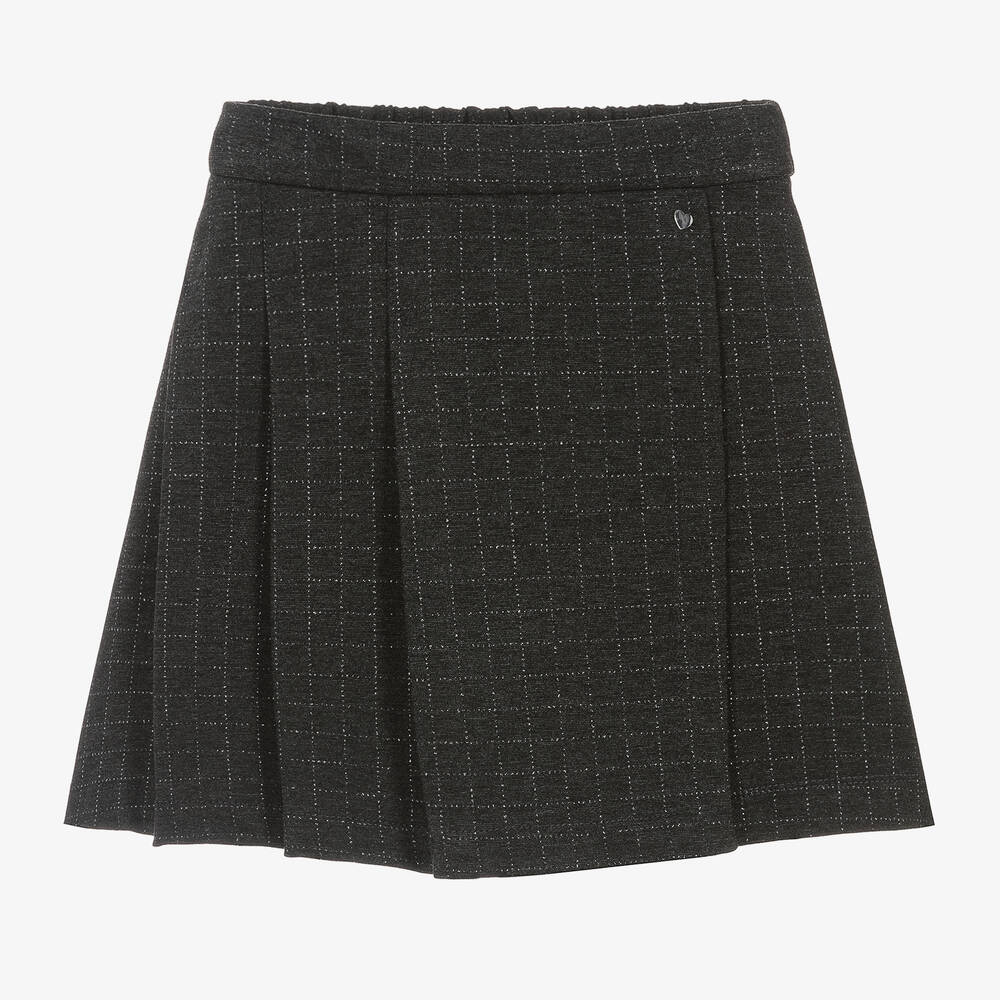 Dark grey check skort for girls by Monnalisa, made in soft Milano jersey. Embroidered with a shimmering silver thread, this preppy design has a wrap-style front and a shiny silver heart logo charm. The waistband is elasticated for a super comfortable yet smart fit.