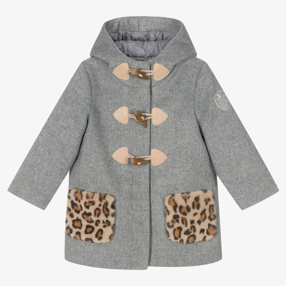 Elegant and stylish, this grey marl duffle coat for girls is by Monnalisa. It has a grey logo crest on one sleeve, with faux fur pockets on the front in beige leopard print. Cosy and warm with a fixed hood, the coat is made in a soft wool blend and has a silky quilted lining. There are classic toggle fastenings on the front, with concealed poppers underneath.