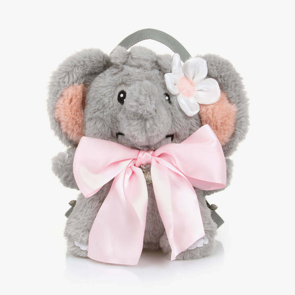 A cute grey elephant backpack for girls by Monnalisa. Made in luxuriously soft plush and padded like a soft toy, this adorable accessory has a tiny compartment that fastens with a simple zip. It comes with a web handle and adjustable shoulder straps. An organza flower appliqué and a pink satin ribbon with logo charm complete the sweet look.