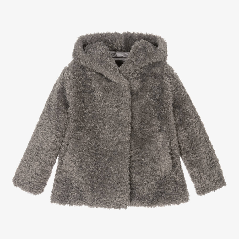 Gorgeous grey hooded coat for girls by Italian brand Monnalisa, made in super soft, cosy faux fur. Lined in sumptuous satin, it has useful, slanted pockets and concealed popper fastenings on the front.