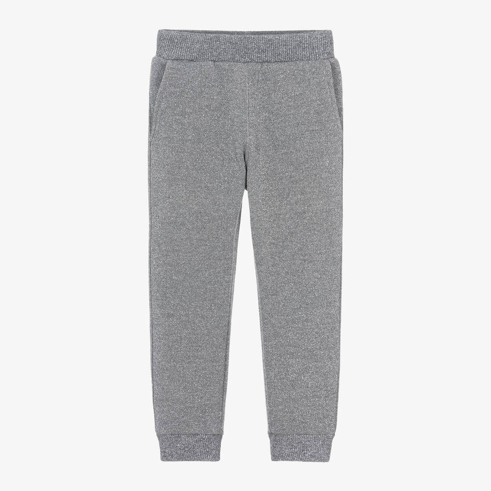 Eye-catching grey joggers for girls by Italian brand Monnalisa, glittering with silver thread and with a spotted black bow appliqué on the back. Made in comfortable, cotton-blend jersey, they are just right for cooler days, with a cosy, fleecy inside and warm, ribbed trims. They have useful, slanted front pockets.
