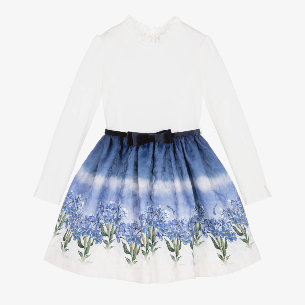 Sweet ivory and blue dress for girls by Italian designer Monnalisa. In silky-soft and lightweight jersey, the bodice is panelled and structured for a lovely silhouette. The cosy long sleeves are gathered on the shoulder for a slight puffed effect and vented on the cuffs for freer movement. Lined with comfortable twill and tulle for volume, the gradient-coloured skirt is designed with a subtle leopard print jacquard pattern and wonderful forget-me-not prints. For different looks, included is a navy blue velvet bow belt to complement the colour palette. The elegant stand-up collar and designer details within the floral print complete this special occasion look.