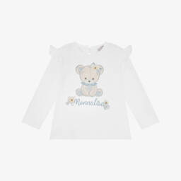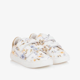Pale ivory and blue skirt for little girls by Monnalisa, showcasing a beautiful print of flowers and bows, with a classic houndstooth pattern. This elegant pleated design is made in lightweight neoprene and has a soft twill lining. The logo-branded waistband is elasticated for comfort and easy pull on.