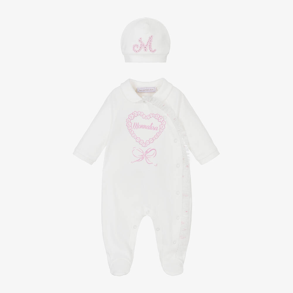A lovely pale ivory babygrow and hat set for girls by Monnalisa, with a pretty pink flowery heart and ribbon bow motif, incorporating the designer's signature logo. Made in comfortable cotton jersey, it fastens asymmetrically with poppers down the front, the babygrow has a sweet Peter Pan collar and tulle ruffle trims. Completing the set is the hat, which has a logo initial on the front in a matching flowery design.
