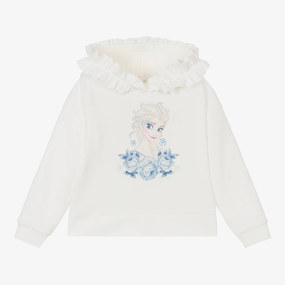 Girls ivory cotton Disney-inspired hoodie by Monnalisa, with a pink and blue Elsa design on the front, featuring roses, snowflakes and sparkling rhinestones. Made in soft jersey, this casual top is warm and fleecy on the inside, with cosy ribbed trims and a split hem for comfort. The lined hood is trimmed with a large ruffle for a pretty finishing touch.