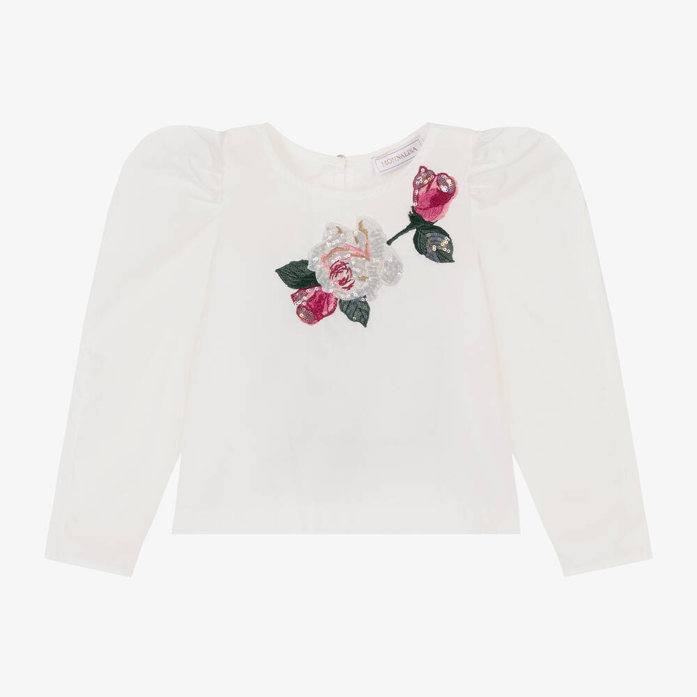 Smart ivory cotton blouse for girls by Italian designer Monnalisa, just right for making an entrance in. It has a beautiful sequinned and embroidered flower appliqué shimmering on the front, and dramatic, leg-of-mutton style, long sleeves. Made in lightweight poplin, it has a crystal keyhole button fastening around the back.