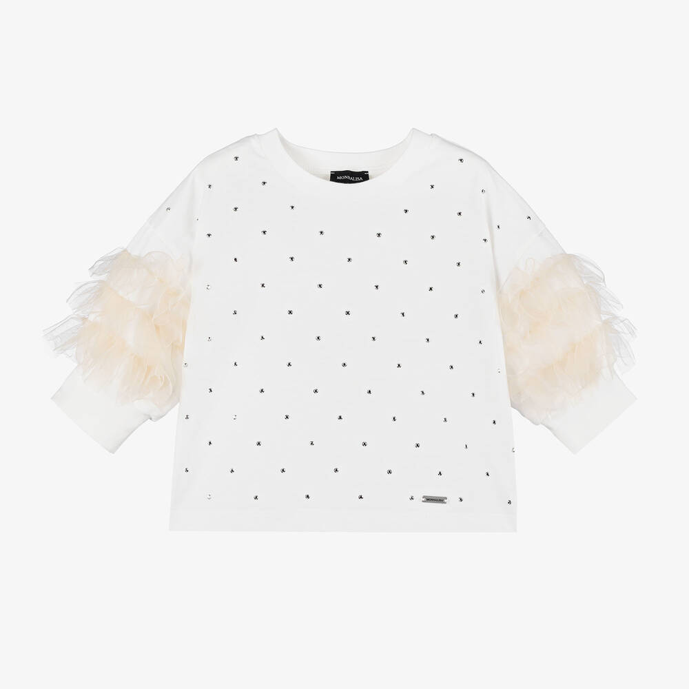 Girls Ivory Cotton & Tulle Stud T-Shirt