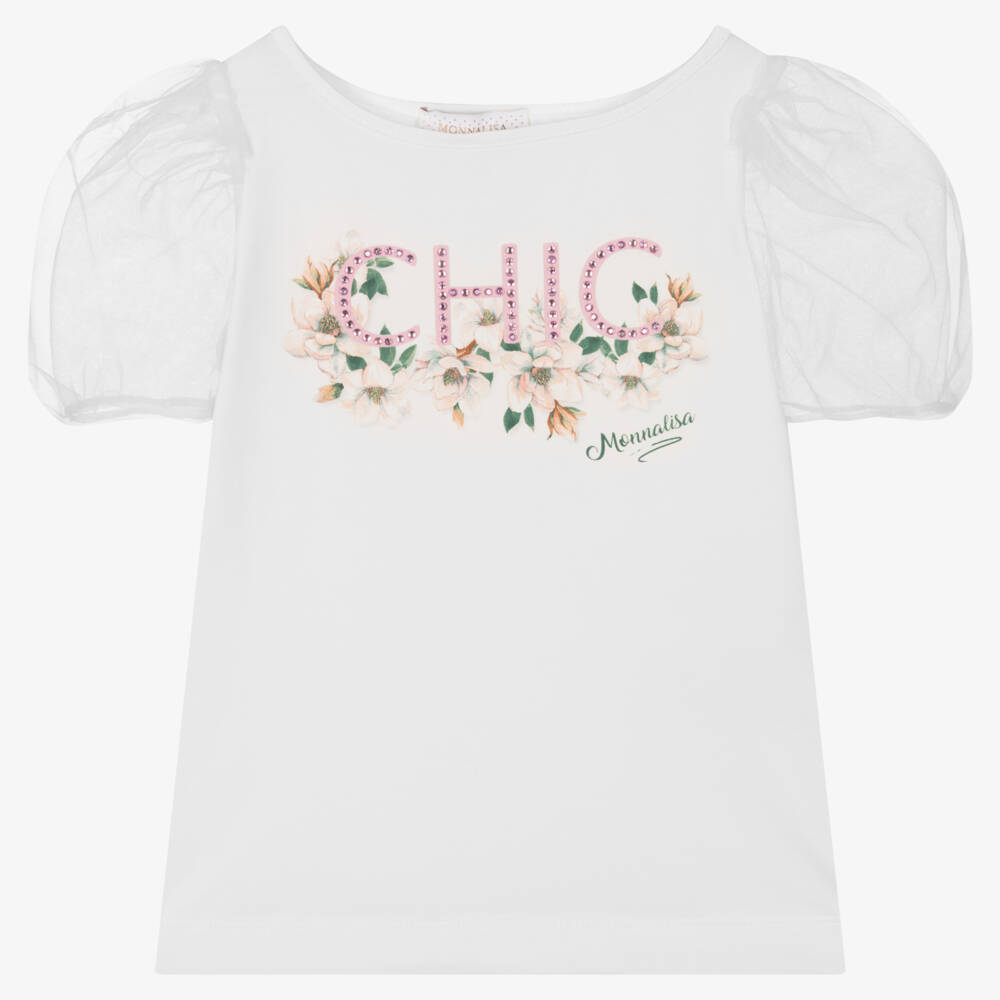 Eye-catching ivory cotton T-shirt by Italian brand Monnalisa. On the front is the word 'Chic', sparkling in pink diamantés, surrounded by a painted-effect floral print and the designer's logo below. Made in stretchy jersey for comfort and fit, this pretty design has puffed sleeves in sheer tulle for a feminine touch.