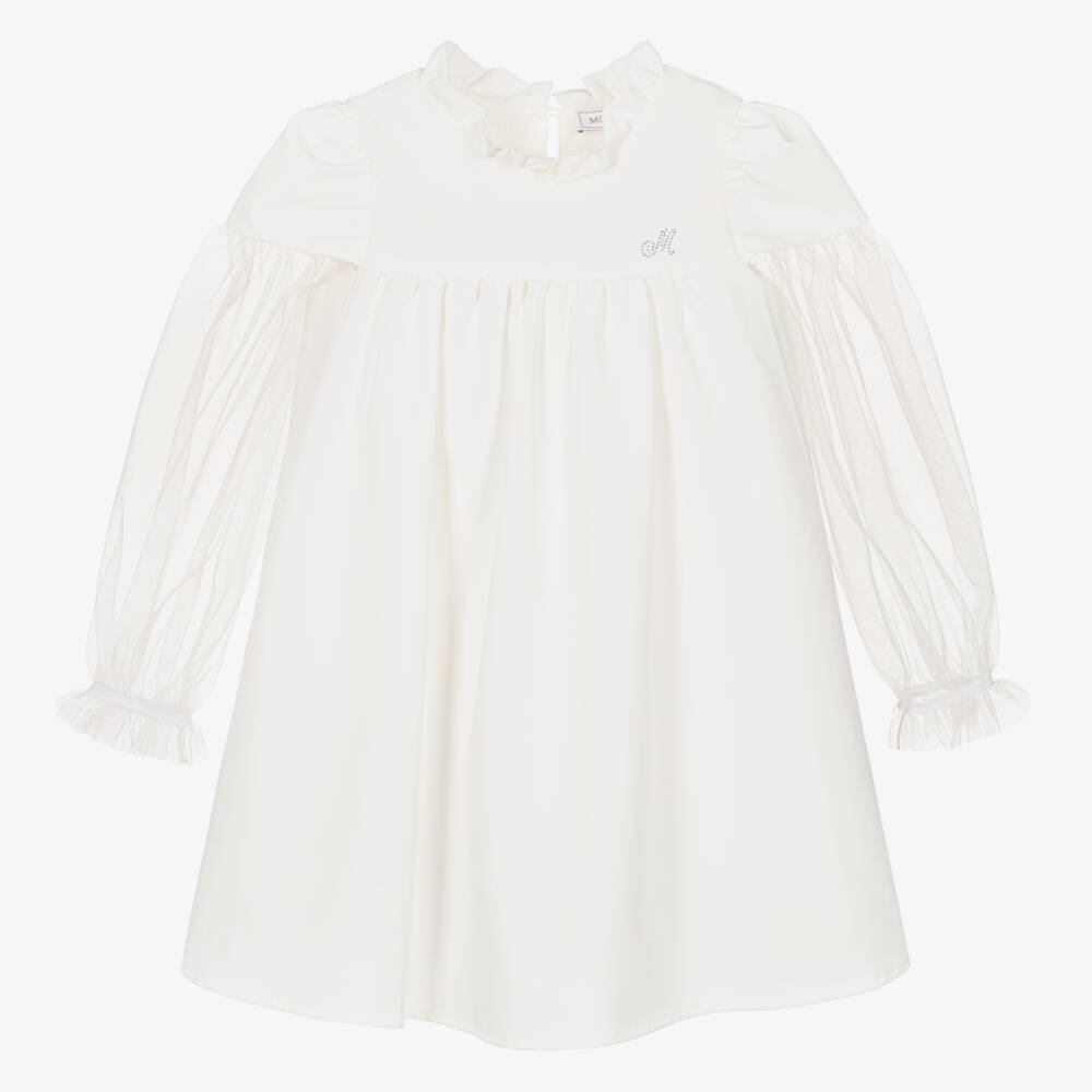 Elegant and sophisticated, this stunning ivory dress for girls is by Italian brand Monnalisa. The bodice has gorgeous silver diamantés in the shape of the brand's 'M' logo, and a chic high ruffled neckline. Floaty and understated, the dress is lined with soft cotton for comfort. The sheer tulle sleeves add a modern touch to this simple style, with elasticated cuffs for a stylish puffed shape.