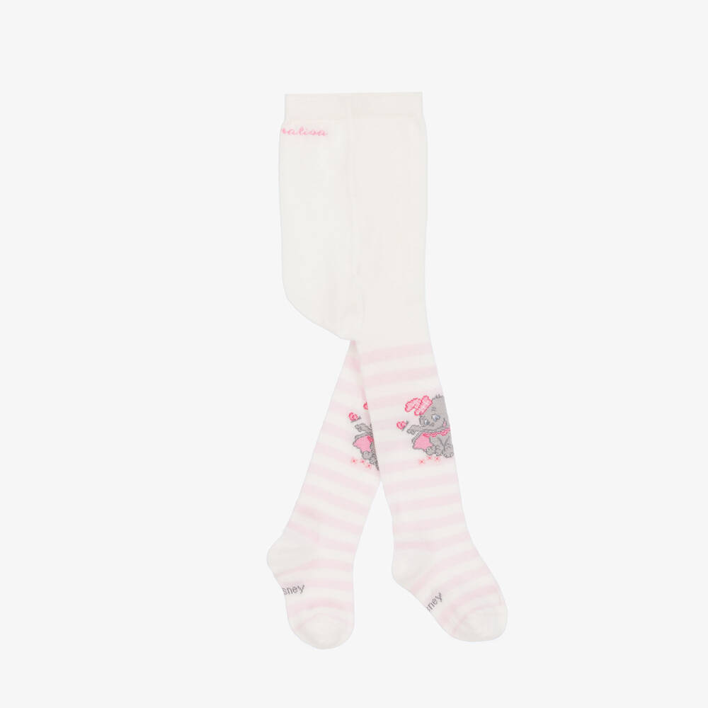 Lovely ivory tights for little girls by Monnalisa, in collaboration with Disney. Patterned with pretty pale pink stripes, they have adorable jacquard Dumbo designs on the legs for a fun look, and a logo detail on the reverse. Comfortable to wear, they are made from a soft cotton-blend knit and have an elasticated waistband.