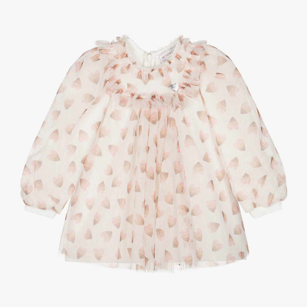 Lovely ivory dress for little girls from Italian designer Monnalisa. This soft dress has layers of sheer tulle, patterned in pink and beige hearts, and sparkling with all-over gold glitter. It has pretty ruffle trims and a silver heart logo charm on the chest for a sweet designer touch. It is lined in a soft, stretchy jersey and fastens with a concealed zip on the back.