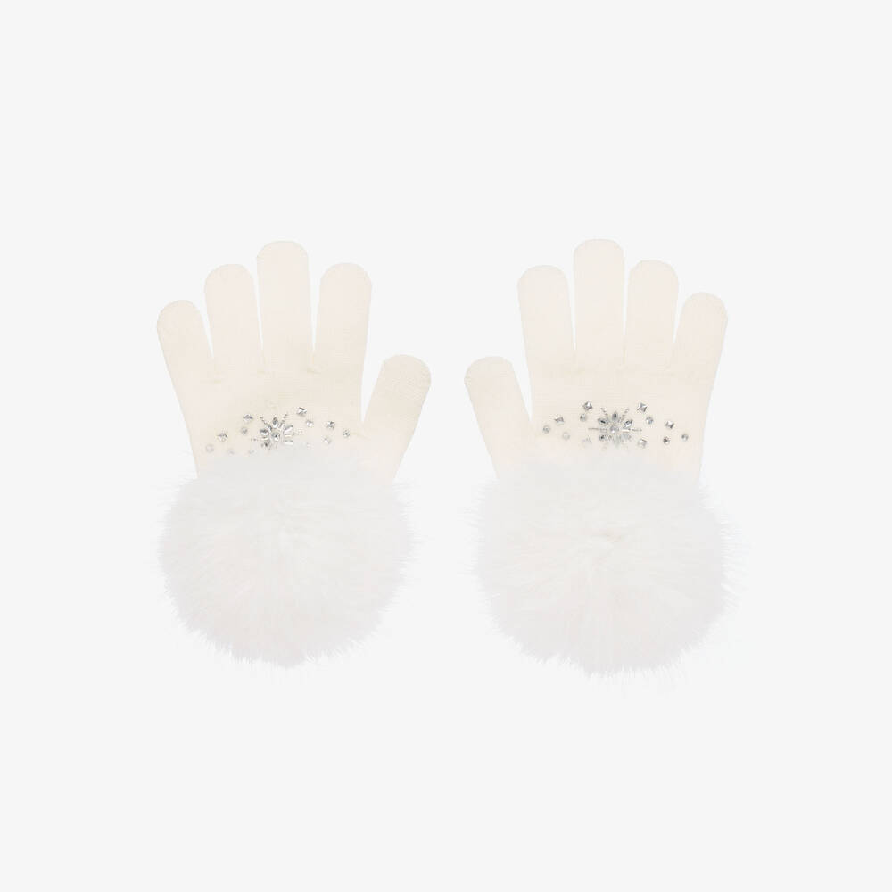 Glamorous ivory gloves for girls by Monnalisa, made from a soft knit. Beautifully decorated with silver diamanté snowflake detailing, they have large white fluffy wool pom-poms on the wrists that detach with poppers to make washing easier. Warm for the cooler weather, they will add an enchanting touch to any outfit.