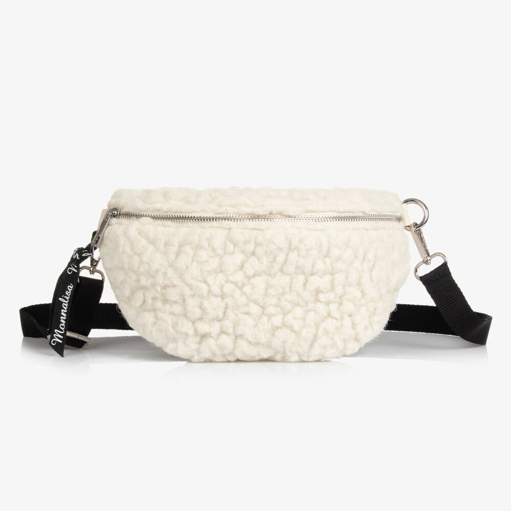 Ivory shoulder bag for girls by Monnalisa, made in soft sherpa fleece. Opening with a branded zip, the main compartment is fully lined and has an interior zip pocket to help organise small essentials. There is branded logo tape on one side and a detachable strap which can be adjusted for the right fit.