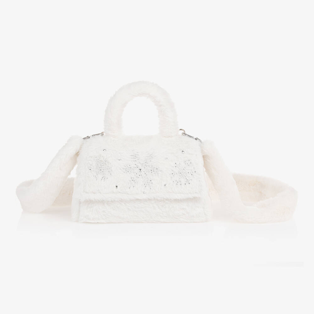 Gorgeous ivory bag for girls by Monnalisa, made in beautifully soft plush. The magnetic popper-fastening flap is embellished with pretty crystal snowflakes, and has a useful carry handle. The small compartment is lined in soft faux leather, with room for all your little girl's small essentials. For versatile wear, it comes with a plush, clip-fastening shoulder strap.