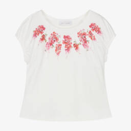 Lovely ivory viscose jersey T-shirt for girls by Monnalisa, featuring a blue floral design around the neckline. For a stylish fit, it has a wide neckline and seamless cap sleeves, gathered at the cuffs.