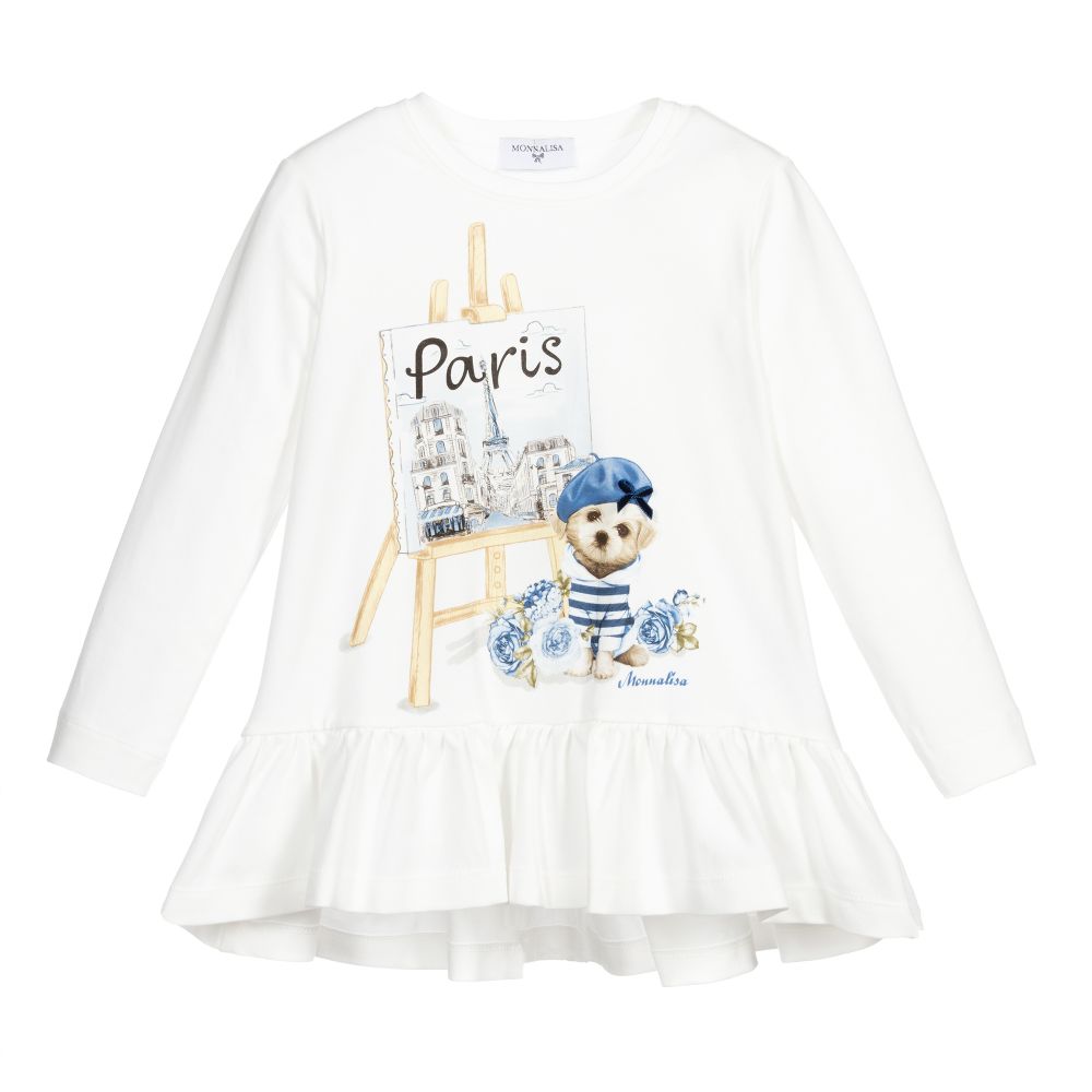 Ivory tunic for girls by Monnalisa, made in soft and stretchy cotton jersey. There is a blue and brown Paris dog print on the front with a blue logo and blue velvet bow. The ruffled hem is slightly longer at the back than the front.