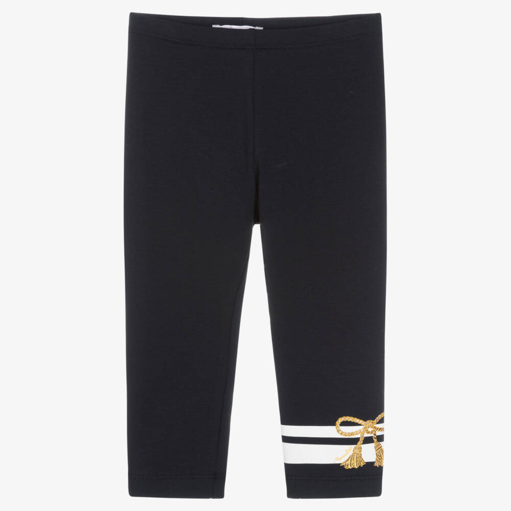 Girls navy blue leggings by luxury brand, Monnalisa. This nautical-inspired design features white stripes and a gold rope motif on one ankle, with the designer's logo on the side. Soft and stretchy, they are full-length and have an elasticated waistband for comfort.