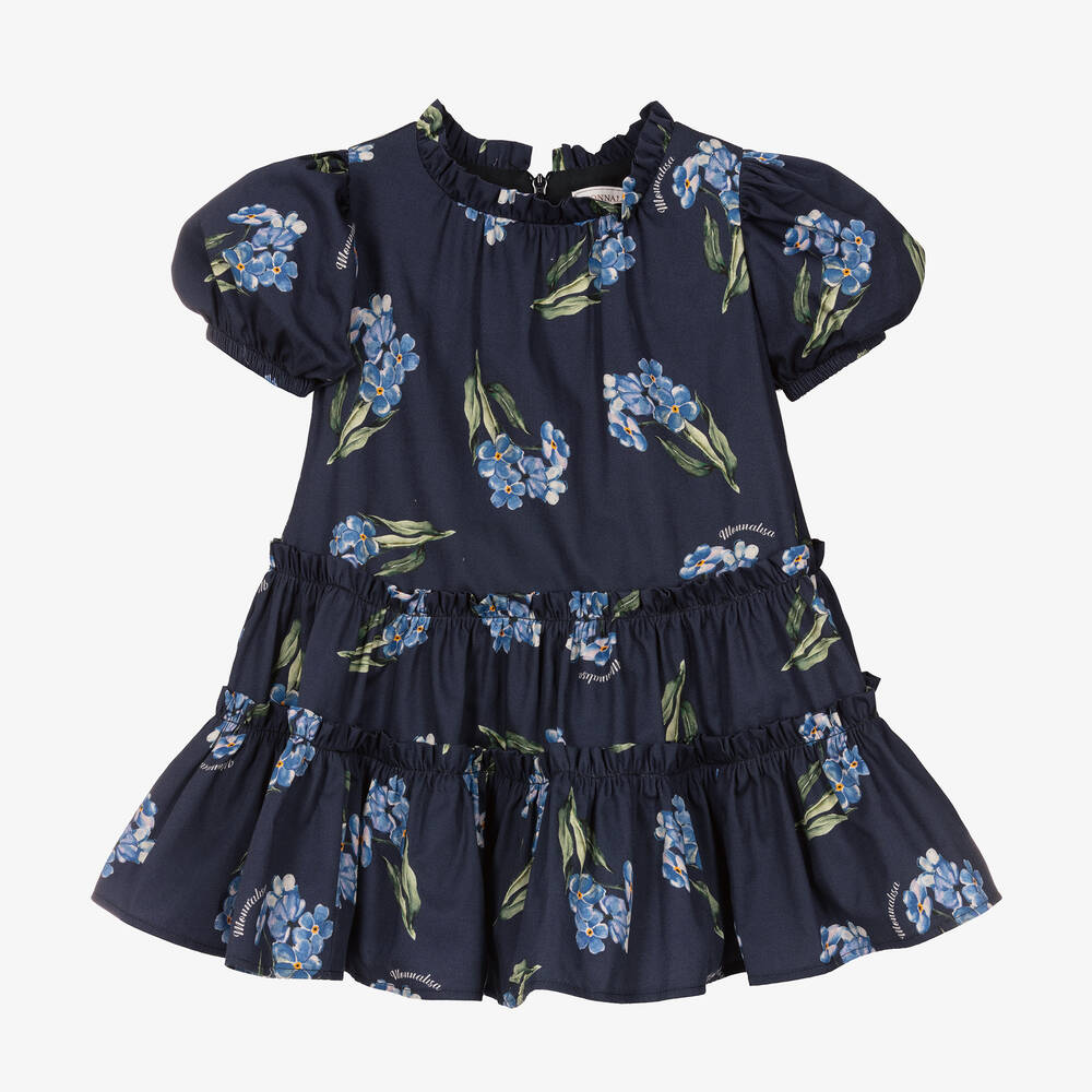 Beautifully elegant navy blue floral dress for girls by Italian brand Monnalisa. Made in soft cotton fabric, it is decorated with lovely forget-me-not flowers and subtle white logos within the pattern. It has ruffles on the neckline and a tiered skirt, with puff sleeves and a slight dropped waist for a relaxed yet feminine look. It is fully lined with soft and lightweight cotton-mix twill.