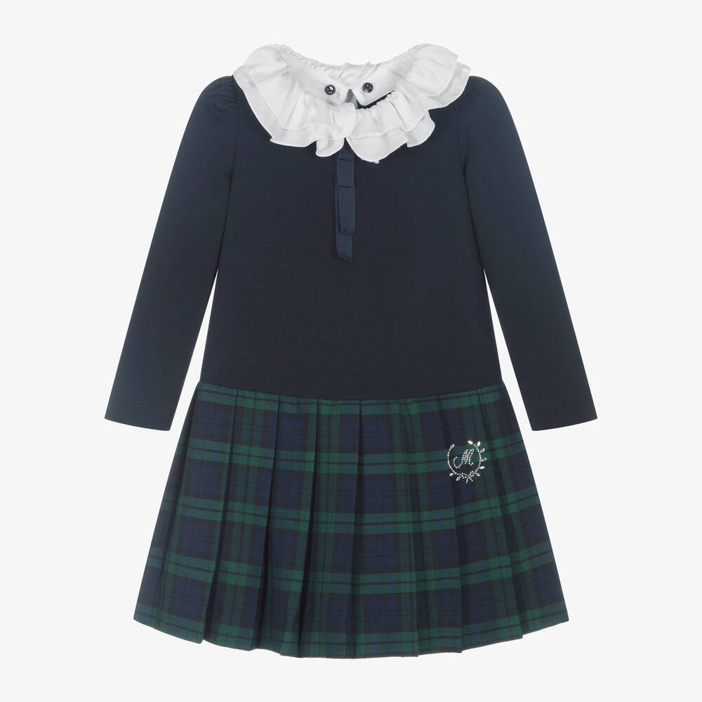 Navy blue dress for girls by Monnalisa, made in soft Milano jersey for comfortable wear. This classic style has puffed long sleeves and a pleated green and blue tartan skirt. Lined for comfort, it is detailed with a diamanté logo design adding a subtle touch of sparkle. There is a grosgrain ribbon trim on the front and a white ruffle collar that can be detached for an alternative look. It fastens neatly with a single keyhole button on the back.