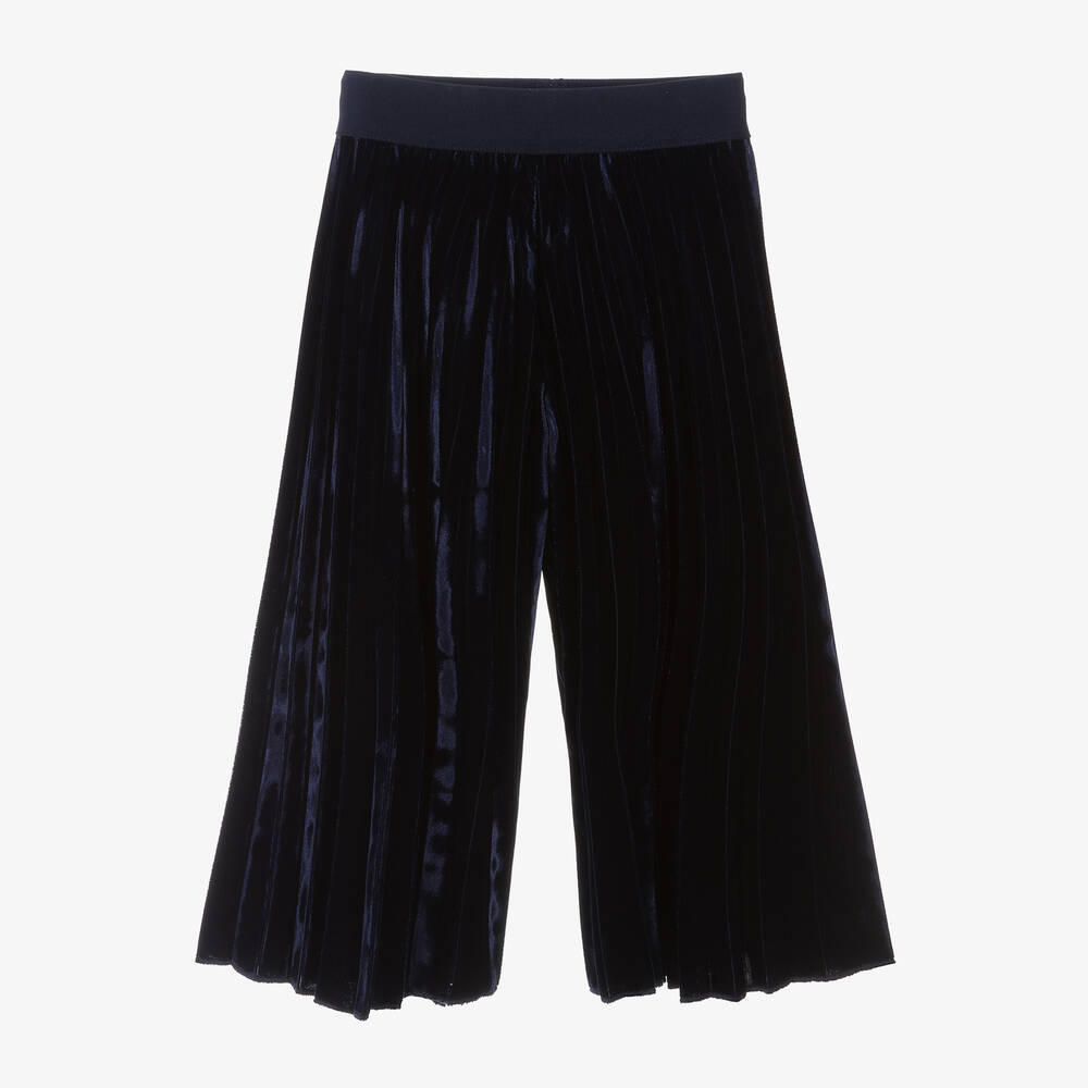 Smart navy blue trousers for girls by Italian brand Monnalisa, ideal for special occasions. Made in soft, finely pleated, cotton velvet, the cuffs are finished with overstitch detailing. Easy to wear, they have a comfortable, elasticated waistband and simply pull up.