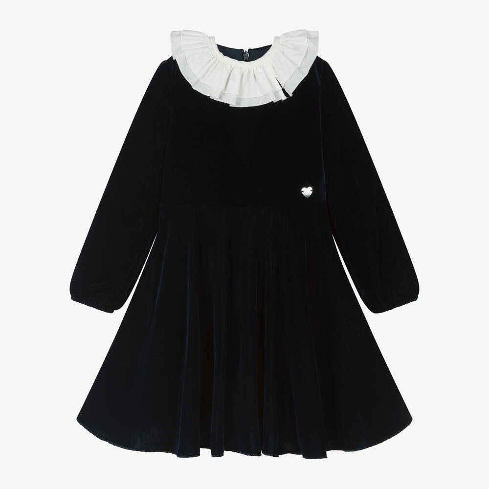 A lovely navy blue dress for girls by Monnalisa, made in beautifully soft velvet for a luxurious feel. This long-sleeved dress can be worn with or without the white, ruffled collar for two different looks. It has a full skirt for plenty of movement and is branded with a silver heart charm just above the waistline. The dress is fully lined with cotton fabric and fastens with a zip on the back.