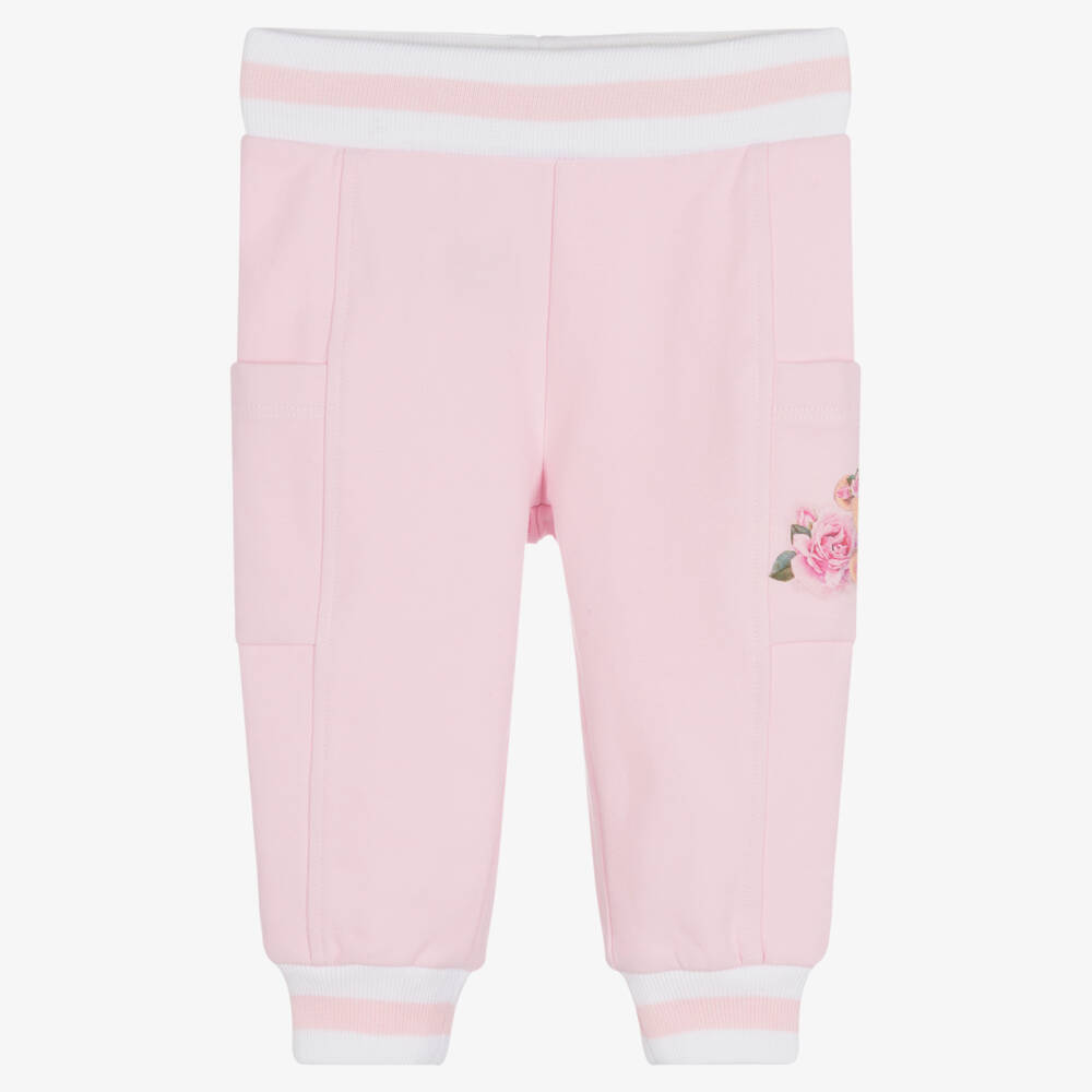 Cute pale pink joggers for little girls by Italian brand Monnalisa, made in soft cotton jersey. These casual joggers have white and pink striped elasticated trims for a comfortable fit. One of the useful side pouch pockets is printed with an adorable teddy bear and rose image for a sweet finish.