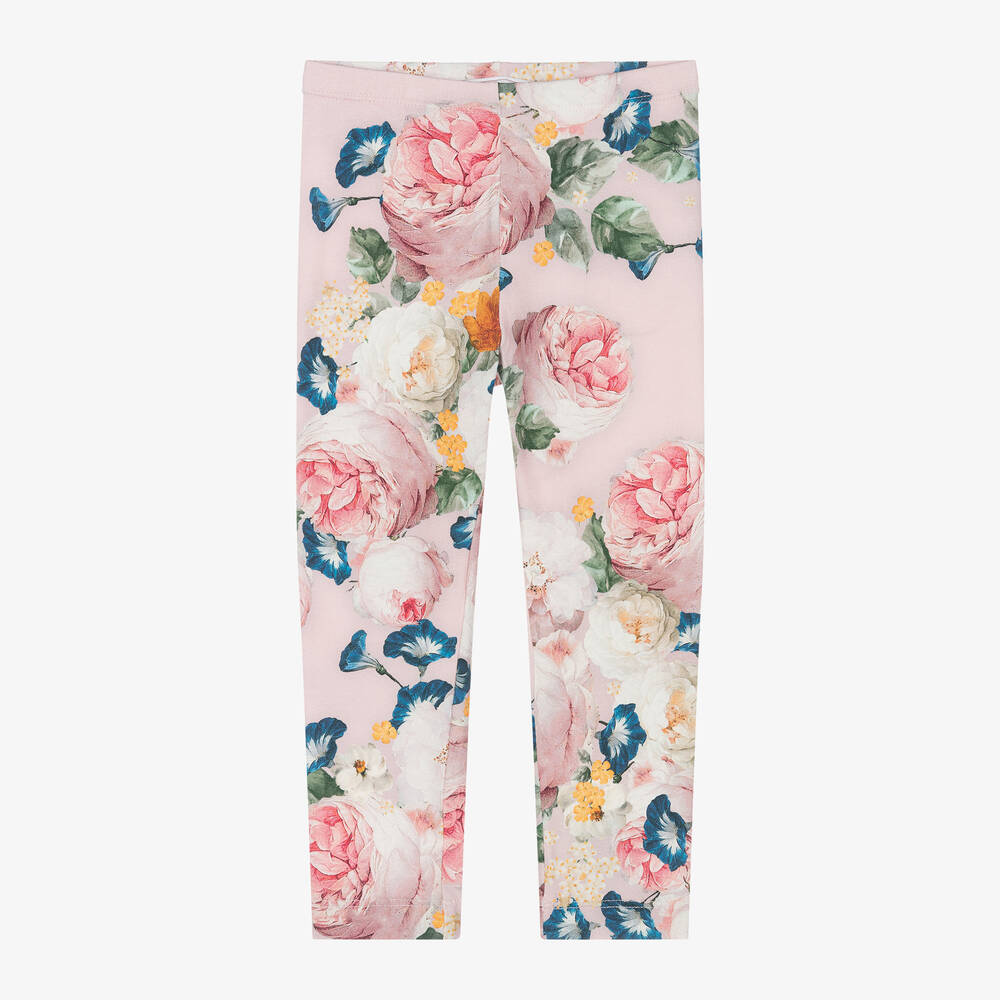 Pale pink cotton leggings for girls by Italian brand Monnalisa, with a beautiful pink, white and blue floral pattern. Full length, they are made in soft, lightweight jersey and have an elasticated waistband for comfort.
