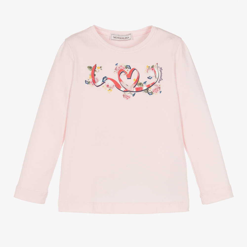 A sweet pale pink long-sleeved top for girls by Monnalisa, made from soft cotton jersey. It is printed with a shiny, iridescent pink ribbon heart design on the chest, surrounded by romantic roses and a logo detail for a branded finish.