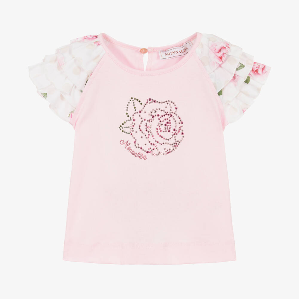 Beautifully feminine pink T-shirt for little girls by Italian designer Monnalisa, with a glittering rhinestone rose and logo on the front in pink and green. Made in comfortable jersey, the T-shirt has layered poplin sleeves patterned with pink roses, logos and beige polka dots. It fastens with a keyhole button around the back.
