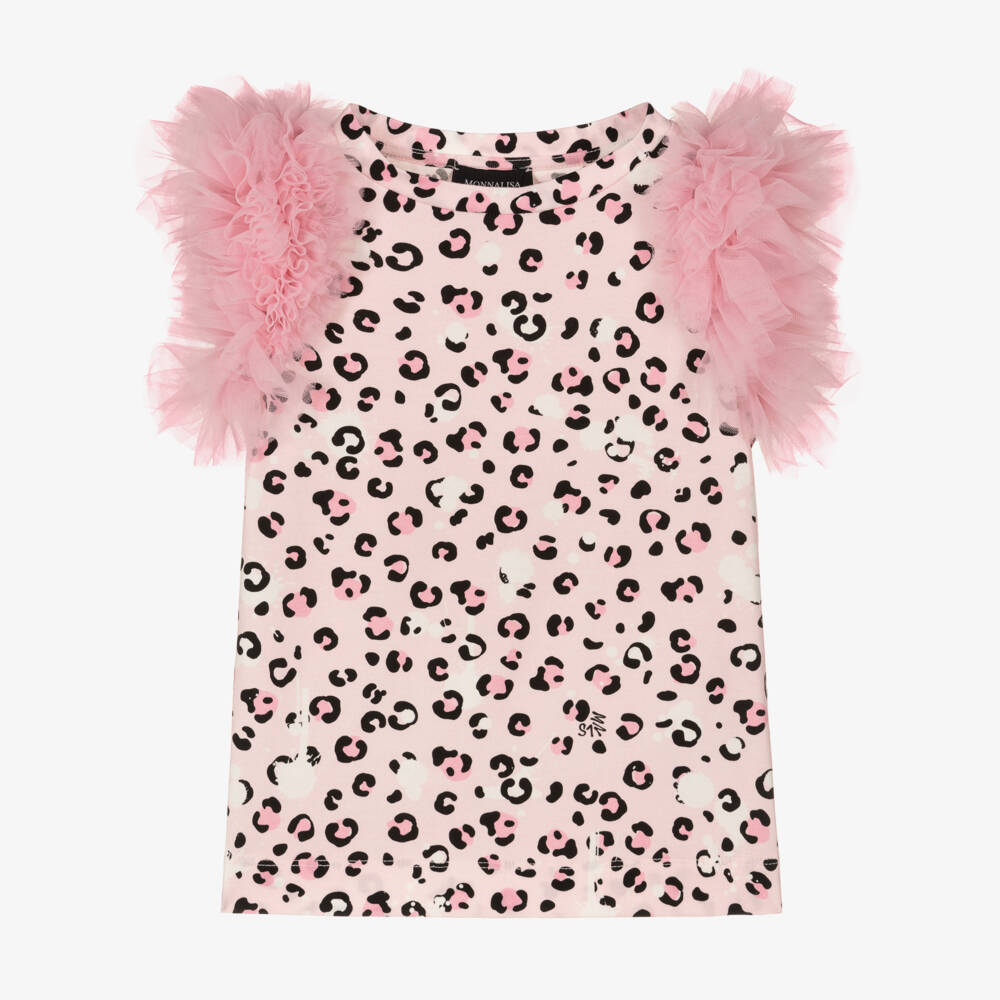 Patterned in a black and pink leopard print, this fun and glamorous pink T-shirt for girls is by Monnalisa. It is made in comfortable cotton jersey, with pink tulle ruffles around the shoulders for a bold and eye-catching look.