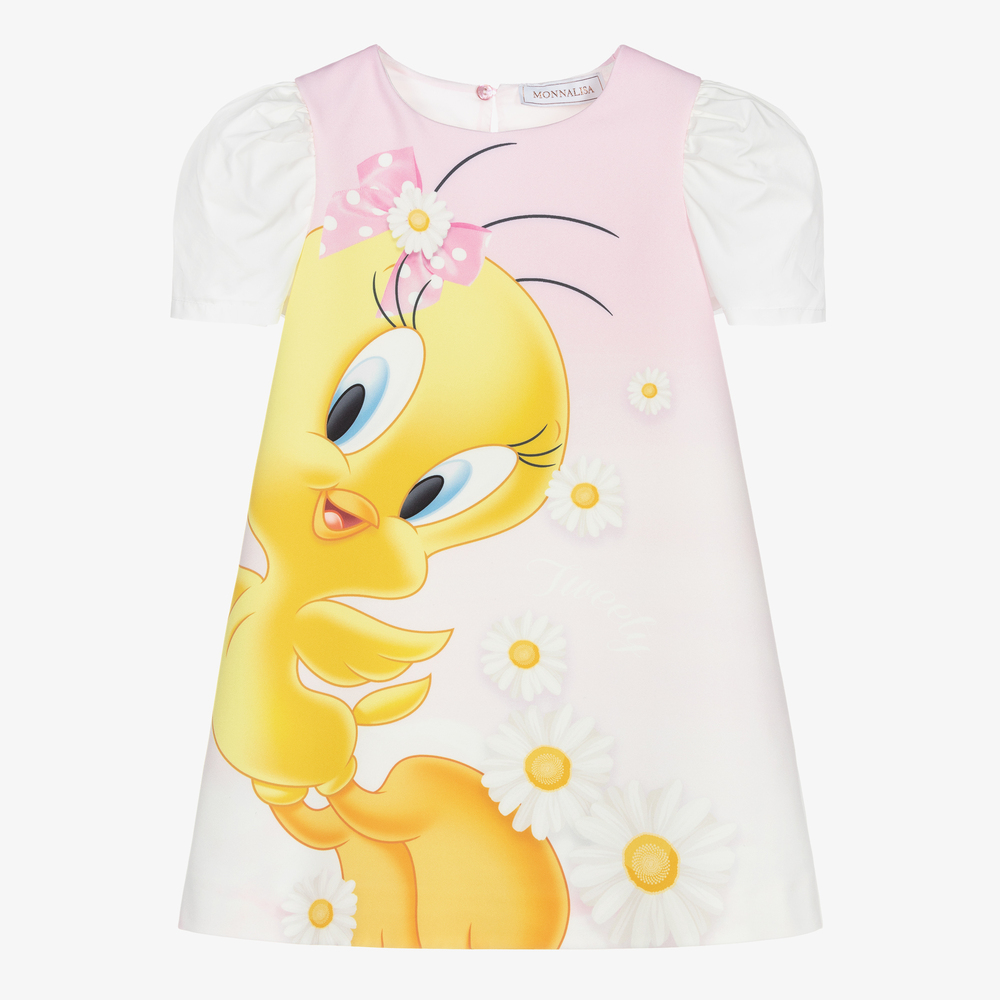 Pale pink dress for girls by Italian designer Monnalisa, with a yellow Tweety, white daisies and clouds printed on the front. Made in lightweight polyester crêpe with padded cotton sleeves, it has the brand's logo on the back.