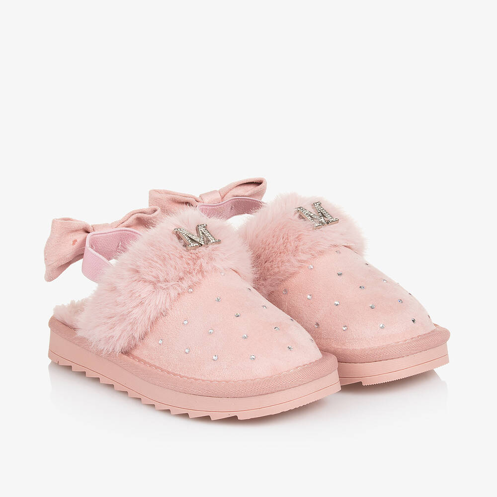 Super stylish, pink faux suede slippers for girls by Monnalisa, embellished with diamantés for a glamorous look. Cosy and comfortable, they have a faux fur lining and trim, with a glittery monogram logo detail. The elasticated heel strap is trimmed with a pretty bow detail and the non-slip outer sole is ridged for good grip.