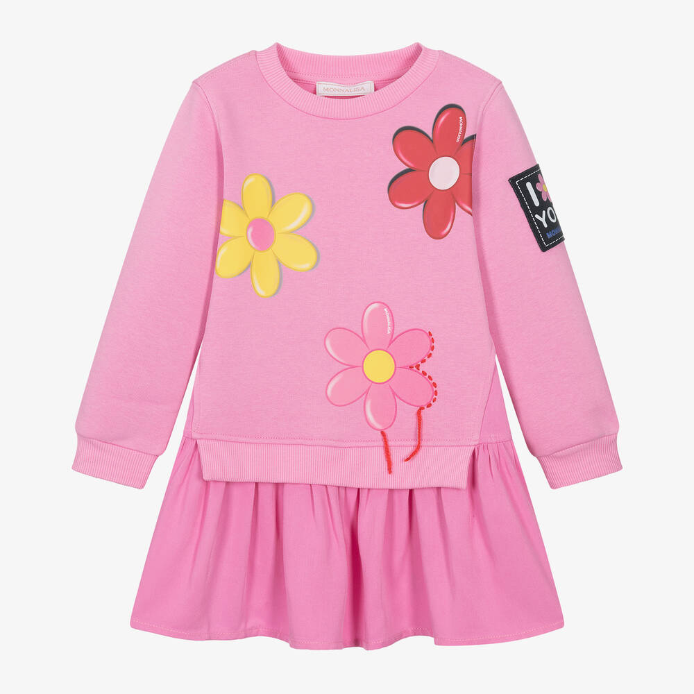 A fun pink sweatshirt dress for girls by Monnalisa, made in a comfortable cotton blend with a black logo patch on one sleeve. The long-sleeved jersey bodice has a casual crew neck and ribbed detailing on the hem and cuffs. It has brightly coloured flowers printed on the front, one outlined with red stitching and the others with white logo prints on one petal. The skirt has a gently gathered seam and is made in soft twill for contrast in textile design.