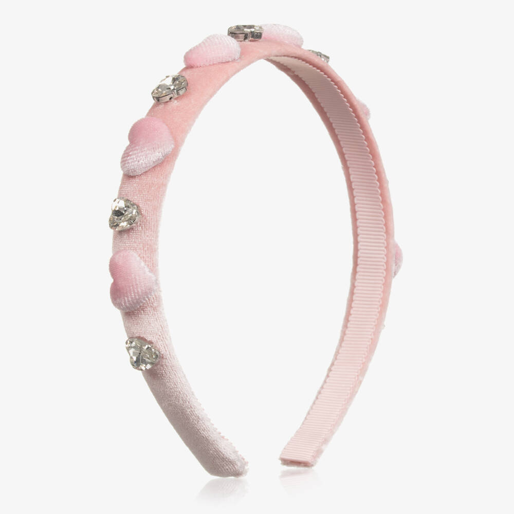 A lovely pink hairband for girls by Italian brand Monnalisa. The velvet-covered band is decorated with cute velvety hearts and heart-shaped diamanté for a touch of sparkle.