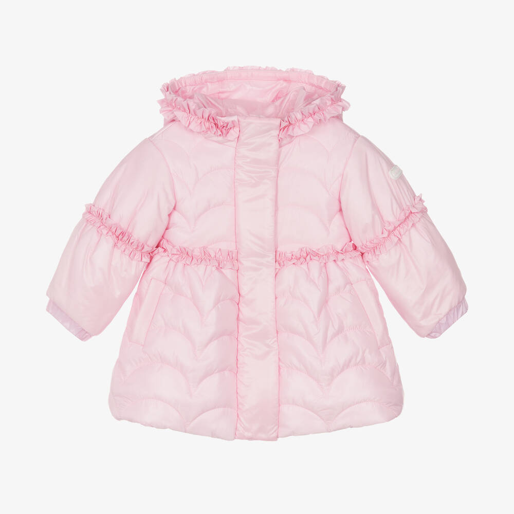 A pink quilted coat for little girls by Monnalisa, with pretty ruffle trims. Silky smooth and softly padded, it has a cosy fixed hood and a front zip fastening with a popper-fastening storm flap. There are useful front pockets and gently elasticated cuffs to help keep out chilly winds. A rubberised white logo on one sleeve adds a subtle designer finish.