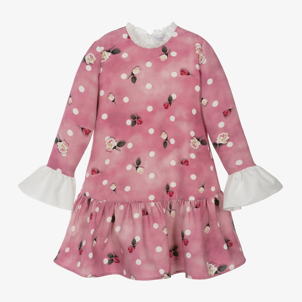 Pretty dusky pink dress for girls by Italian brand, Monnalisa. Patterned with white polka dots and romantic flowers, it has a white frilled neckline and bell sleeves. There is a seamless, concealed zip on the back and a soft viscose lining for comfort.