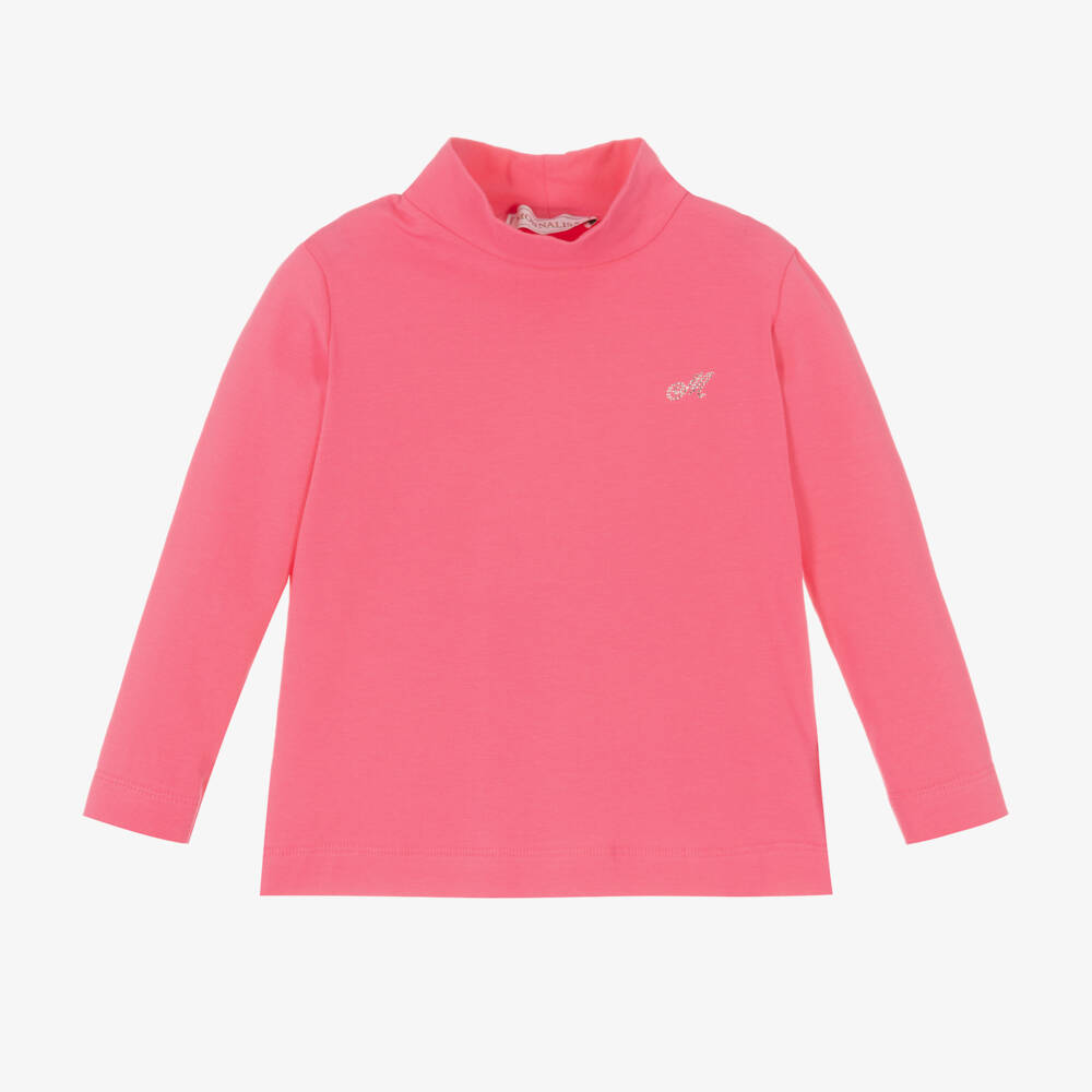 Lovely pink cotton top for girls by Italian brand Monnalisa. Made in a soft and stretchy jersey, this long-sleeved, roll neck style is ideal to wear alone or as a layering piece. For an extra girly touch, there is a sparkling diamanté logo on the chest.