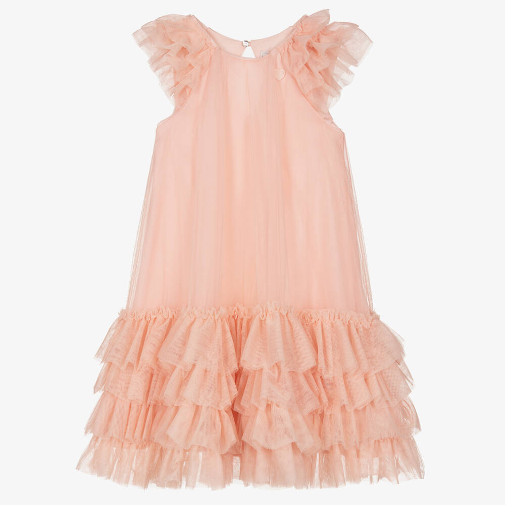 Enchanting pale pink dress for girls by Italian designer Monnalisa, made in layers of tulle with a soft voile lining. It has frilled sleeves, a heart-shaped charm logo on the neck, and a voluminous layered ruffle skirt for a pretty, romantic look. It has a shiny button fastening on the back.