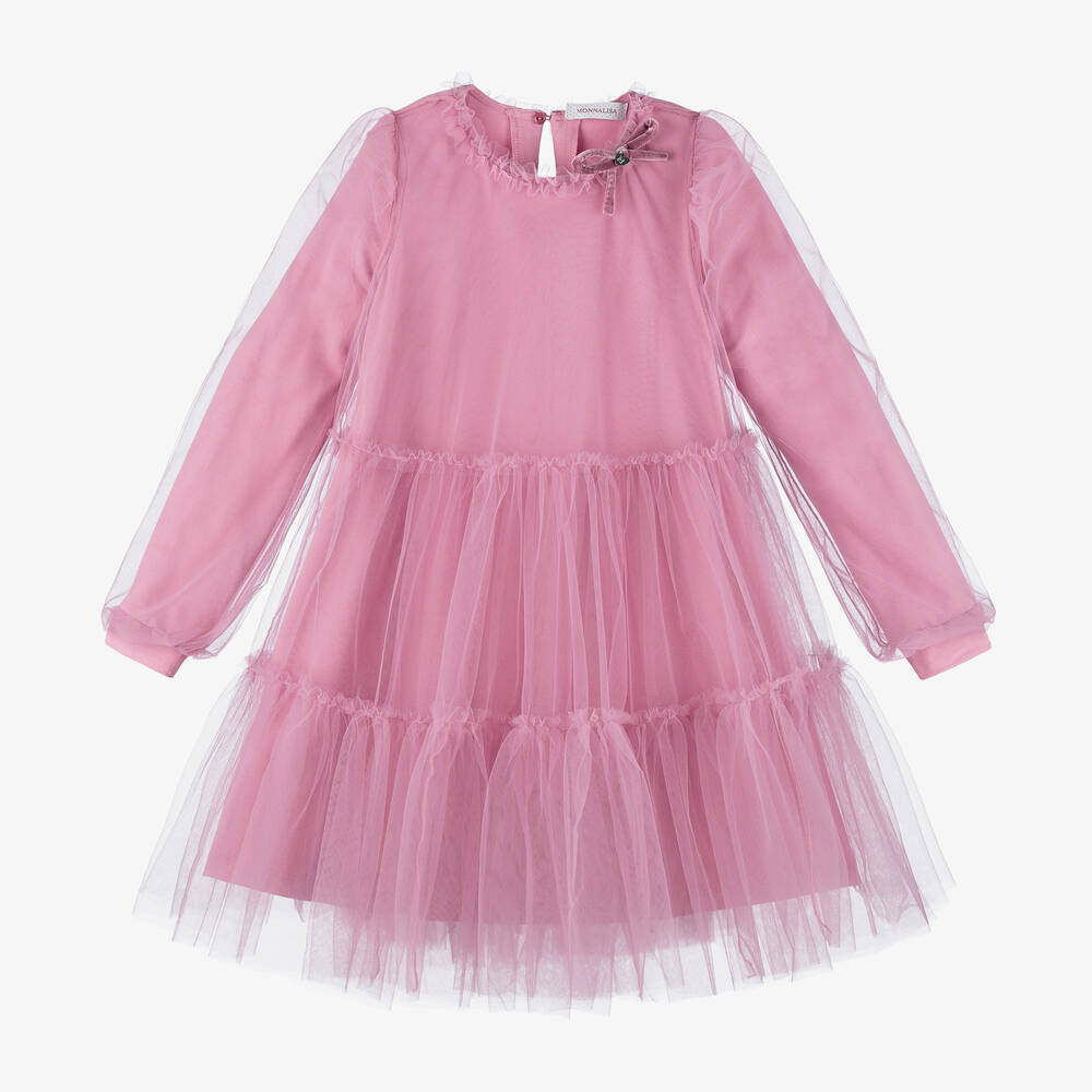 In a lovely rich shade of pink, this long-sleeved dress for girls by Monnalisa is made in tiered layers of soft tulle. Both stylish and comfortable, it is lined in soft and stretchy cotton jersey, with gently ribbed cuffs and a single button fastening on the back. The rounded neckline is trimmed with a ruffle and, for a pretty finish, there is a velvet bow and silver heart logo charm stitched on one side.