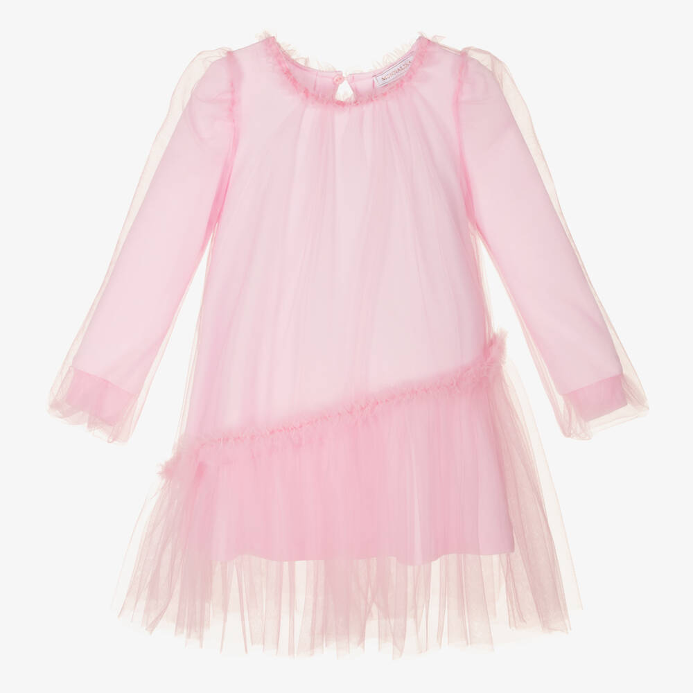 Lovely light pink dress for girls by Italian brand Monnalisa, made in layers of delicate tulle. Romantic and whimsical, it has a ruffled neckline, gently puffed shoulders and an asymmetrical, dropped waist for a beautiful, feminine silhouette. It is comfortably lined in soft cotton jersey and secures with a keyhole button fastening on the back. There is a small logo-embossed charm underneath the fastening for a sweet, discreet designer finish.