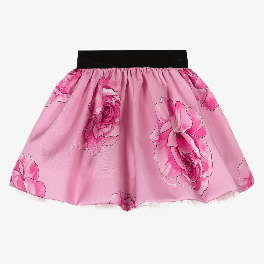 Pink floral skirt for girls by Italian brand Monnalisa Chic. It is made in silky-smooth twill, with a wonderful rose pattern and subtle script logo detailing. Lined with comfortable cotton-mix twill and tulle for volume, the skirt has a beautifully soft velvet waistband, stretchy for comfort on little tummies.